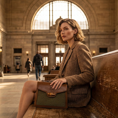 Where classic British heritage meets the quiet grace of the East. This piece is crafted from hand-selected vegetable-tanned leather in a rich vintage cognac hue, paired with our signature diamond-lattice bamboo weave.